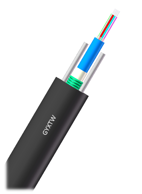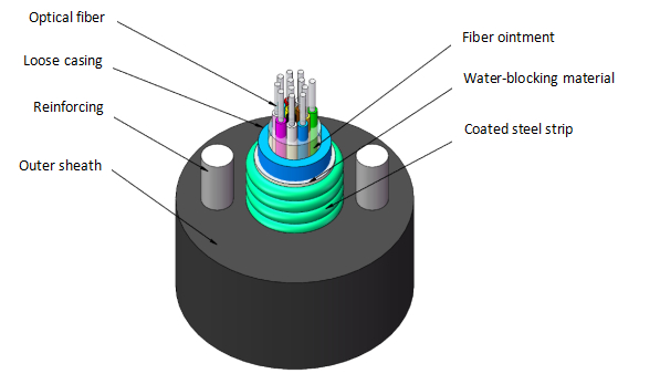 Descrizione del prodotto [ Componente rinforzato in metallo, tipo a tubo centrale, completamente riempito, cavo ottico per esterni di comunicazione con guaina in acciaio-polietilene ] La struttura del cavo ottico consiste nell'inserire fibre ottiche monomodali o multimodali in un tubo a struttura lasca in plastica ad alto modulo riempito con composto impermeabile e posizionarlo al centro del cavo. Materiali di blocco dell'acqua sono posizionati tra l'esterno del tubo e la striscia di acciaio. Due fili di acciaio paralleli sono incorporati nella guaina come supporti di rinforzo e il lato esterno è estruso e avvolto con una guaina in polietilene legato per formare il cavo.